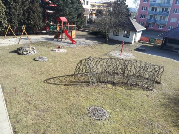 Dětem je k dispozici velká školní zahrada, vybavená dřevěnými průlezkami. Často využíváme i dalších možností, které nám nabízí příroda v okolí MŠ. V případě nepříznivého počasí se mohou děti „dokonale vyřádit“ v blízké tělocvičně ZŠ.